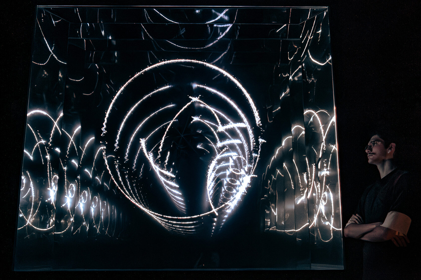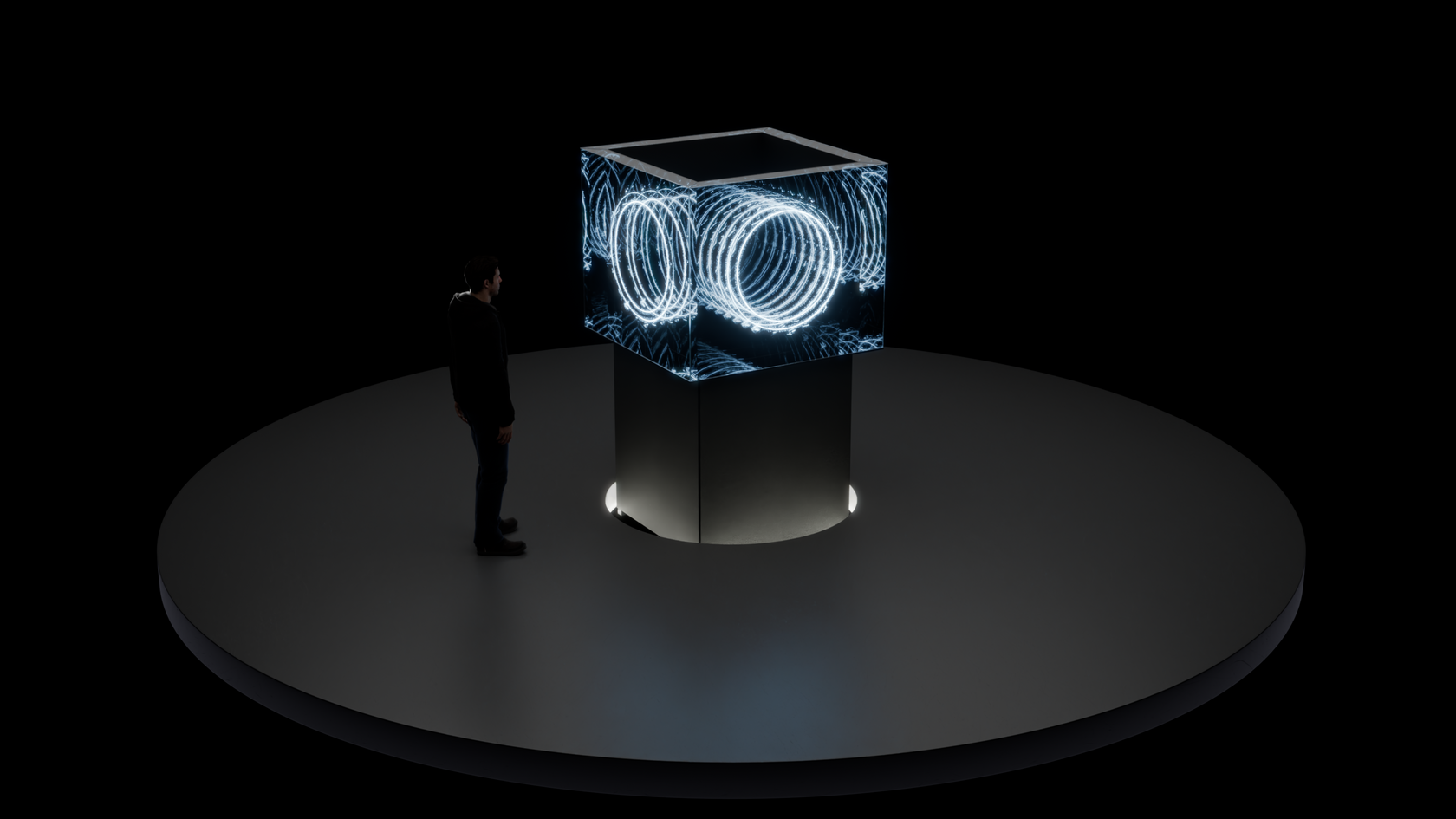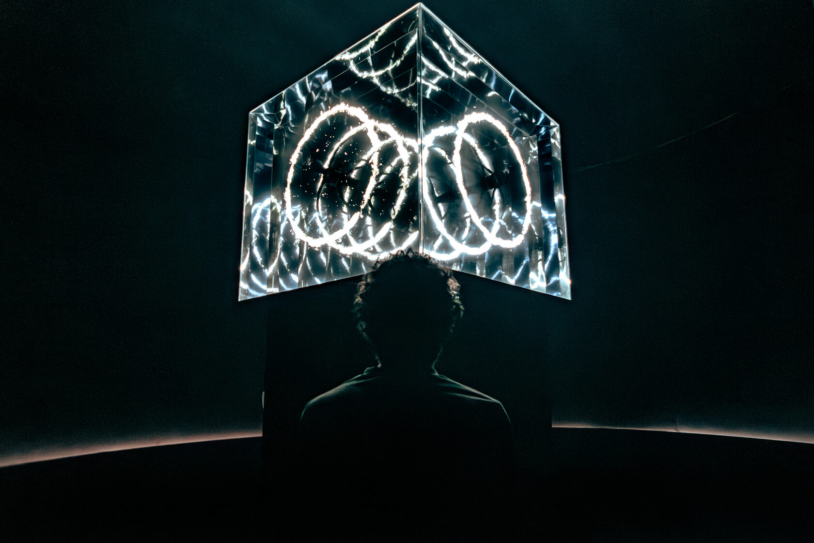 The platform beneath the feet transmits low-frequency vibrations, below the threshold of human hearing, merging auditory, visual, and tactile stimuli into a synesthetic perception.